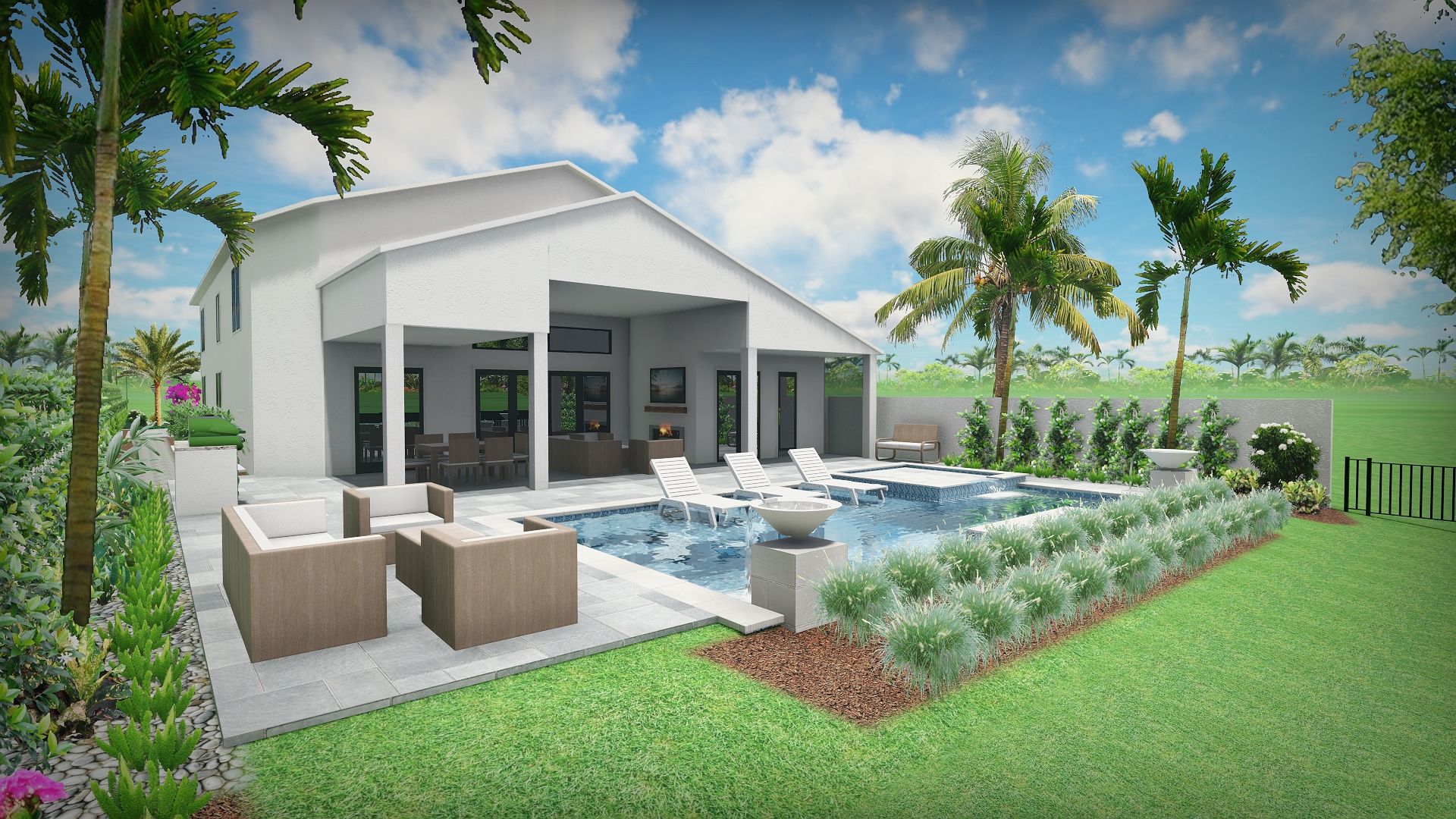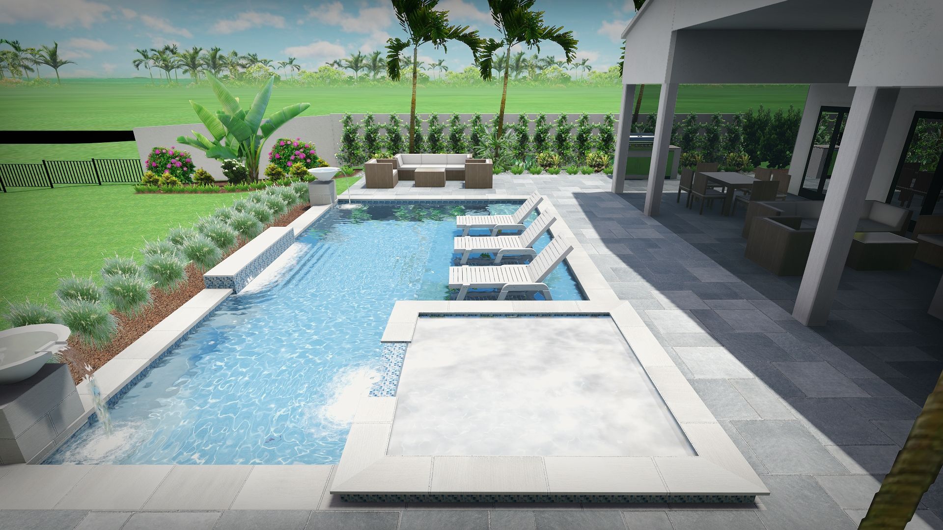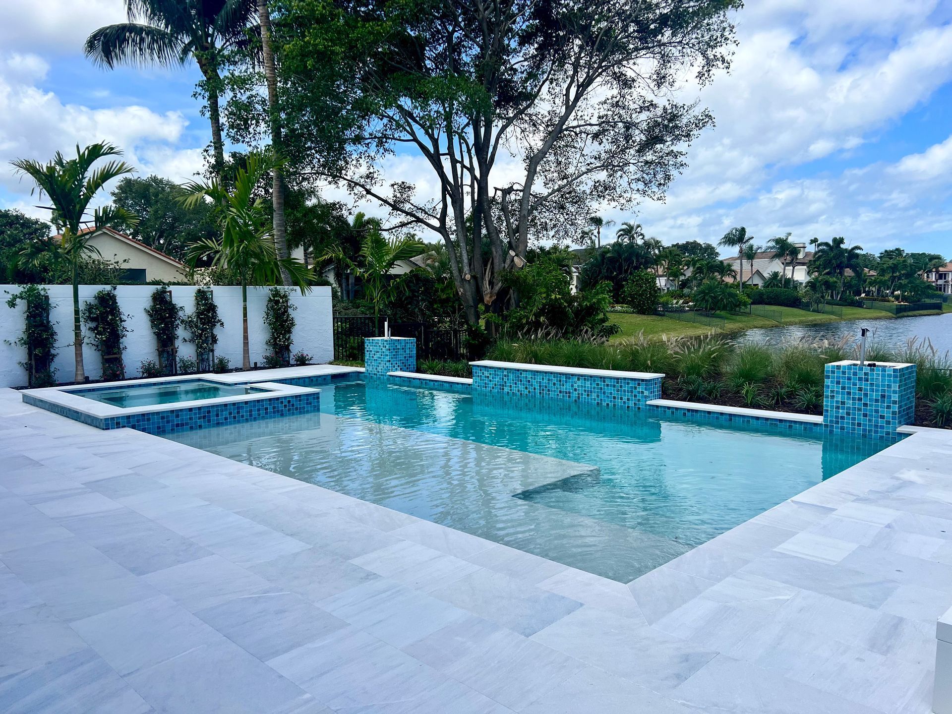 The updated layout includes a swimming pool with a sun shelf, a spa, a raised water wall, and natural stone pavers, all enhanced by refreshed landscaping to showcase the breathtaking lake views.